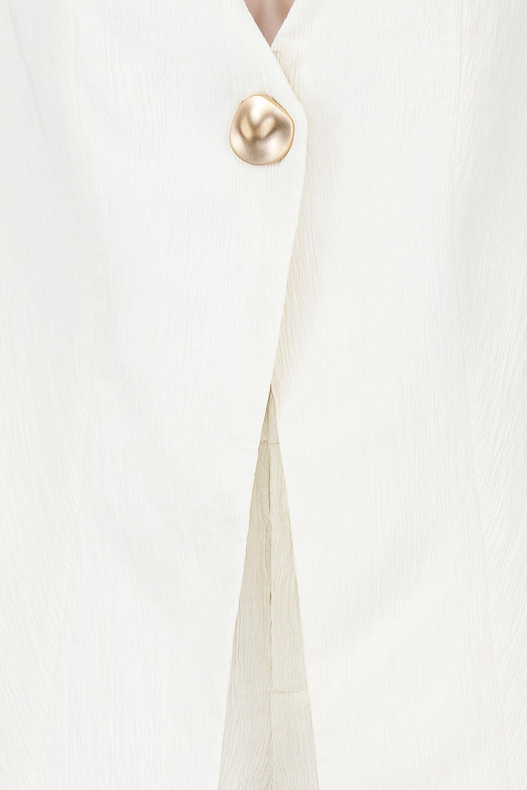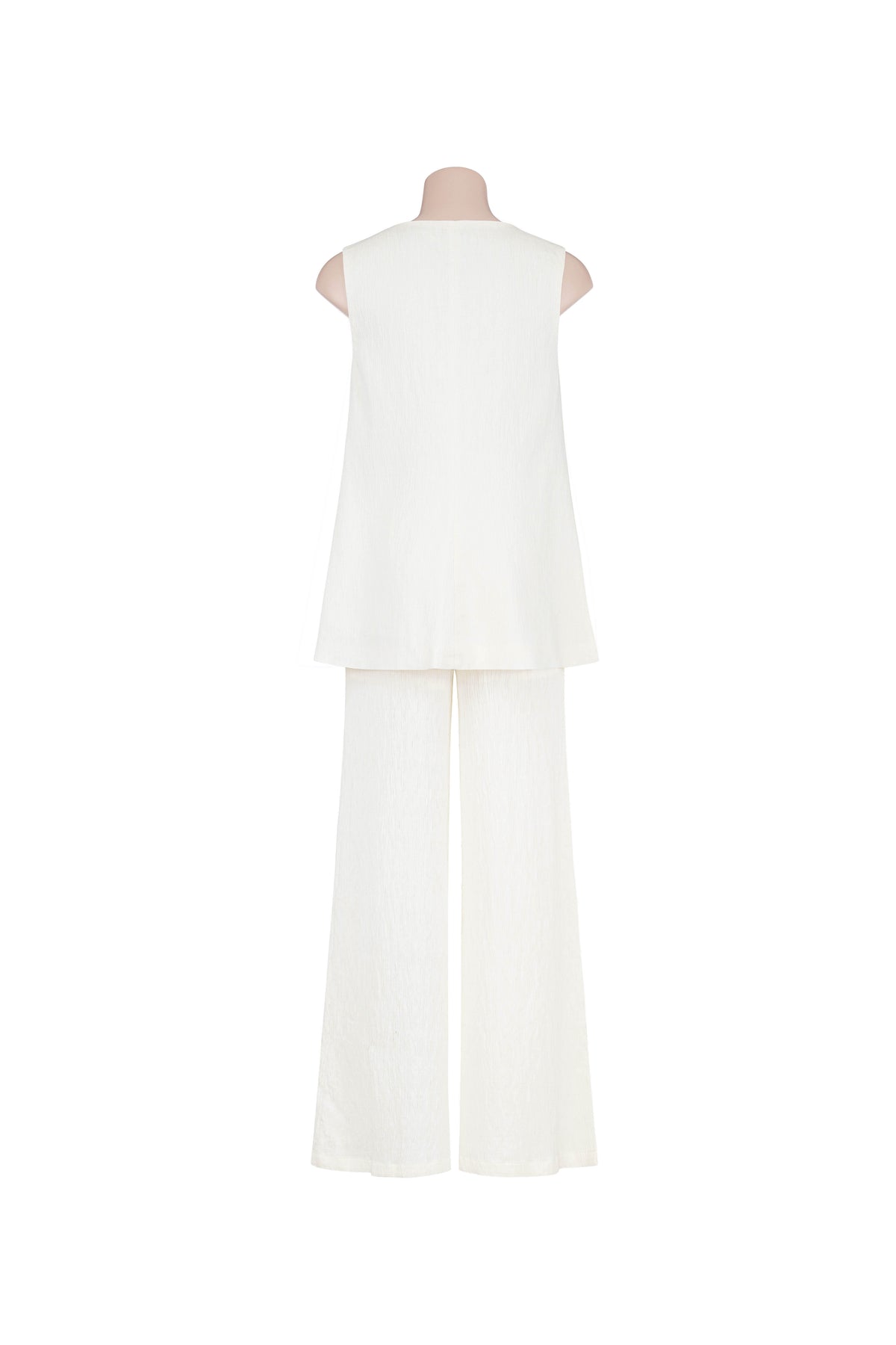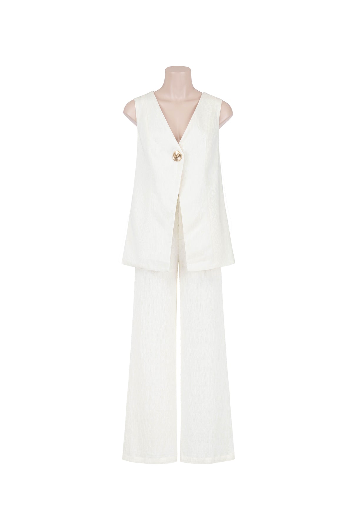 Crafted from a luxurious rayon-nylon blend with cotton lining, the Selena Set combines refined elegance with practical functionality. The coordinated vest top features distinctive gold button accents, while the tailored pants offer convenient front pockets and a smooth zip closure. A sophisticated two-piece ensemble designed for effortless style.