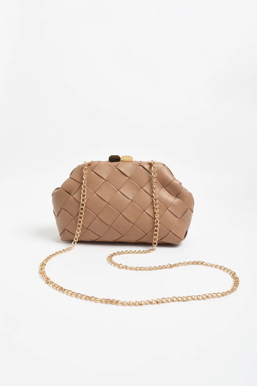 Regular price $119.95The Tara Diamond Weave Timber Clutch in Camel features a timber frame and clasp with diamond weave detailing, a magnetic closure, and an optional vegan leather strap.