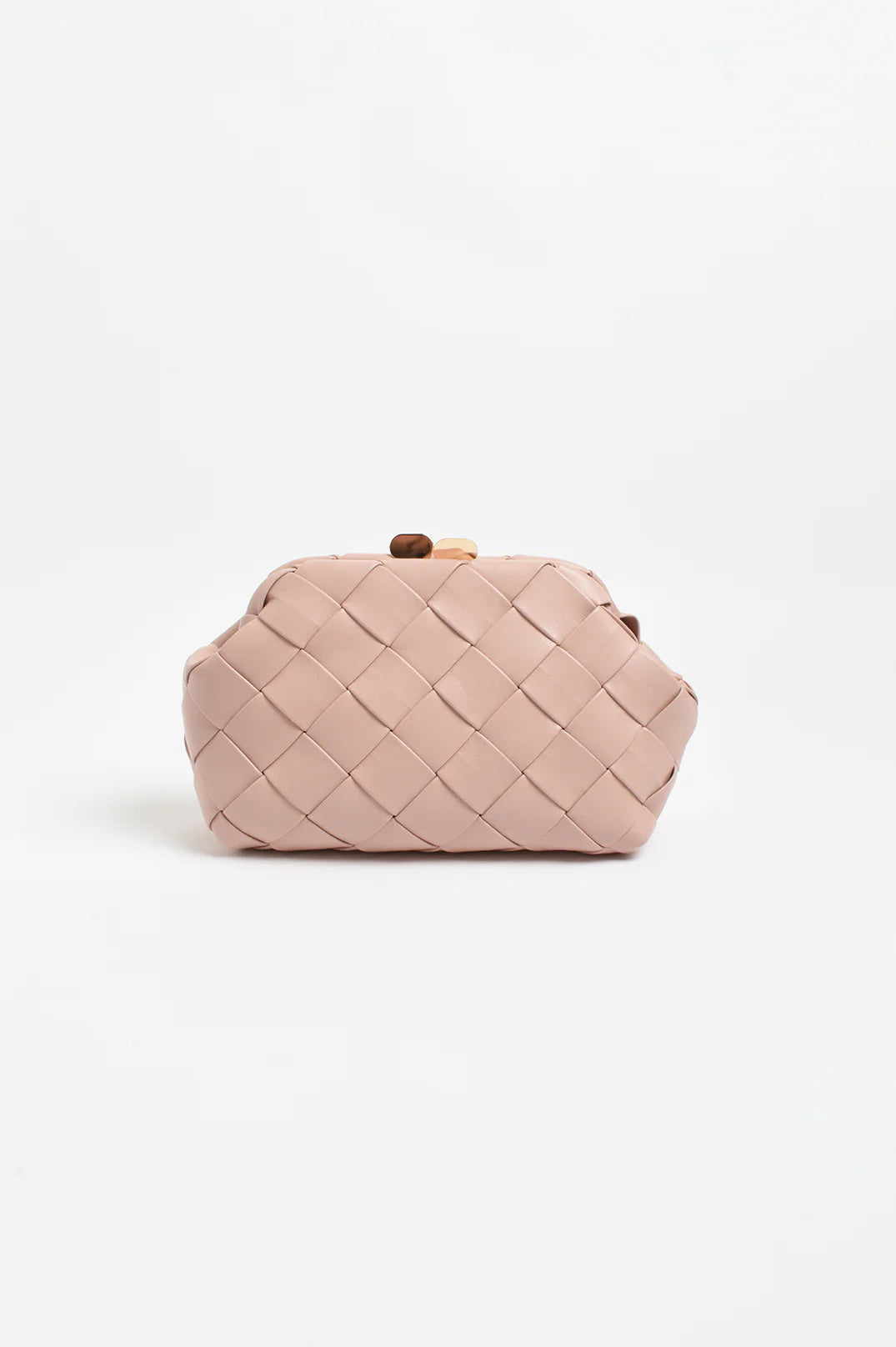 The Amelie Weave Clutch in Pink is crafted from woven vegan leather and finished with gold hardware, featuring an optional chain strap and internal zip pocket for elevated everyday styling.