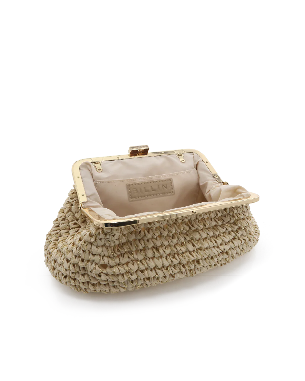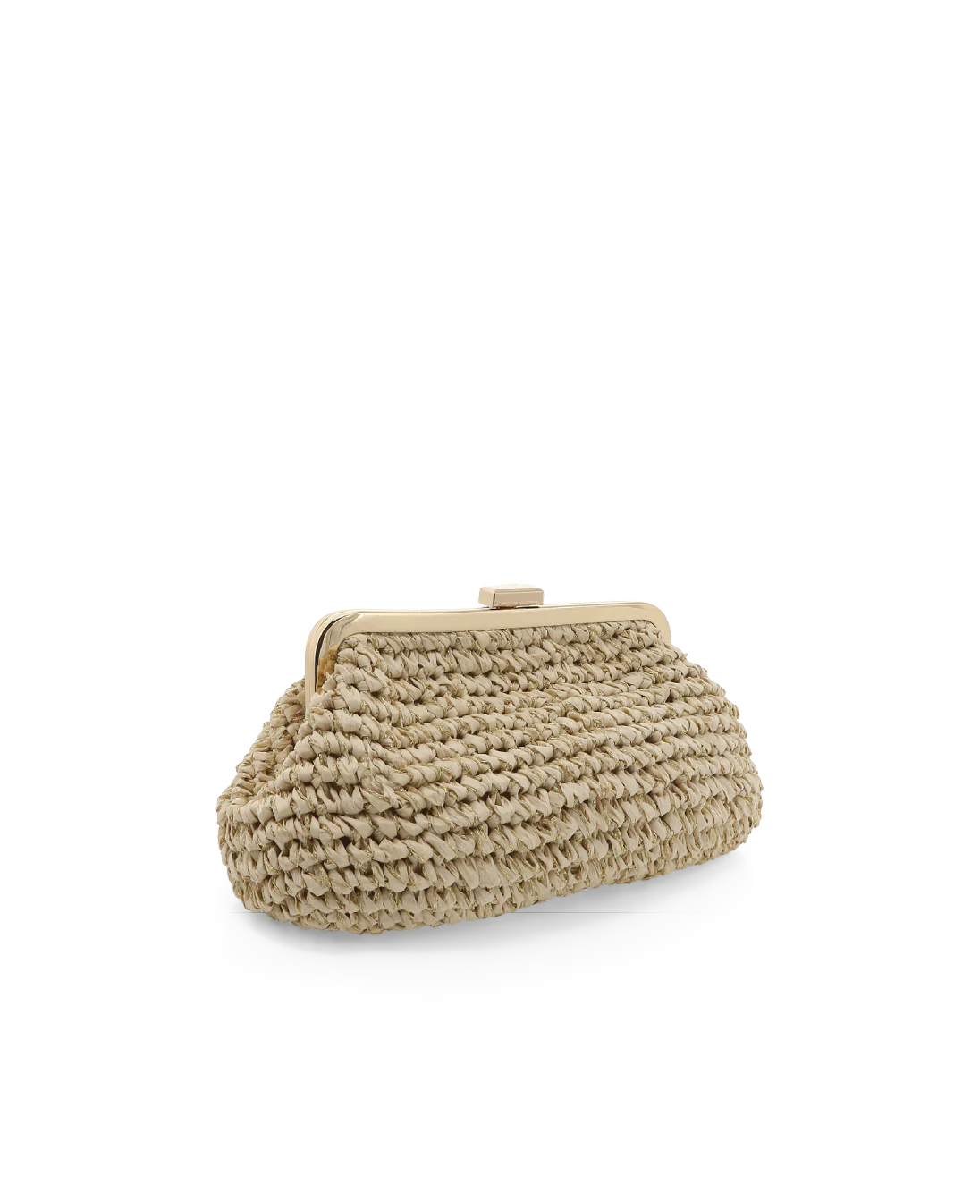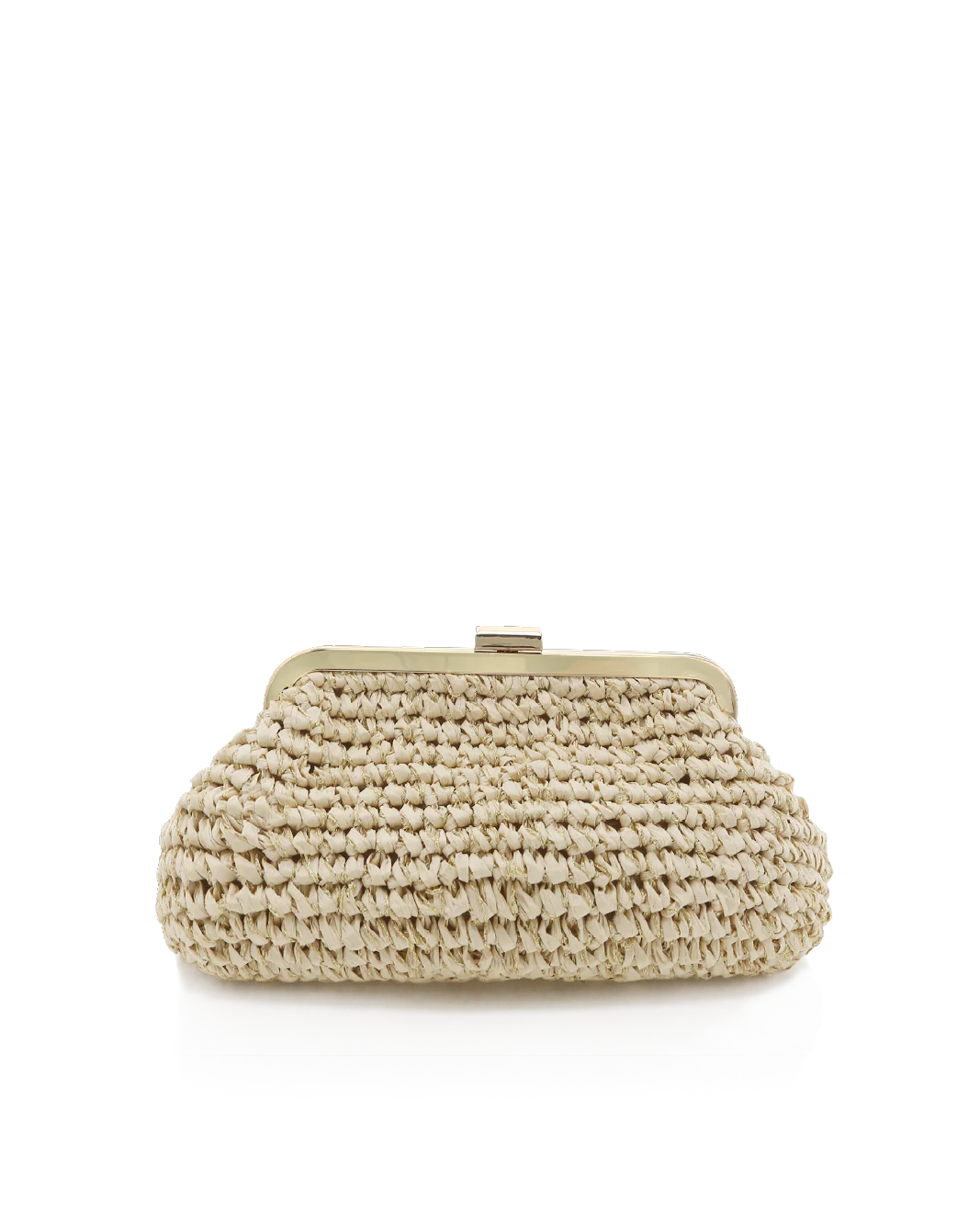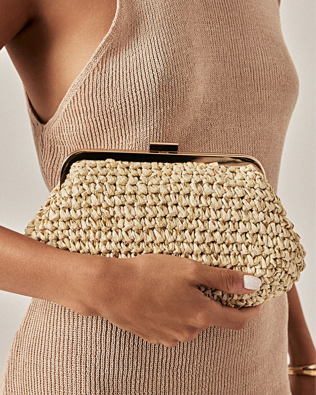 A chic raffia clutch, woven from natural fibres for a textured, earthy look. Lightweight and stylish, it’s perfect for adding a touch of effortless elegance to both casual and dressy outfits.
