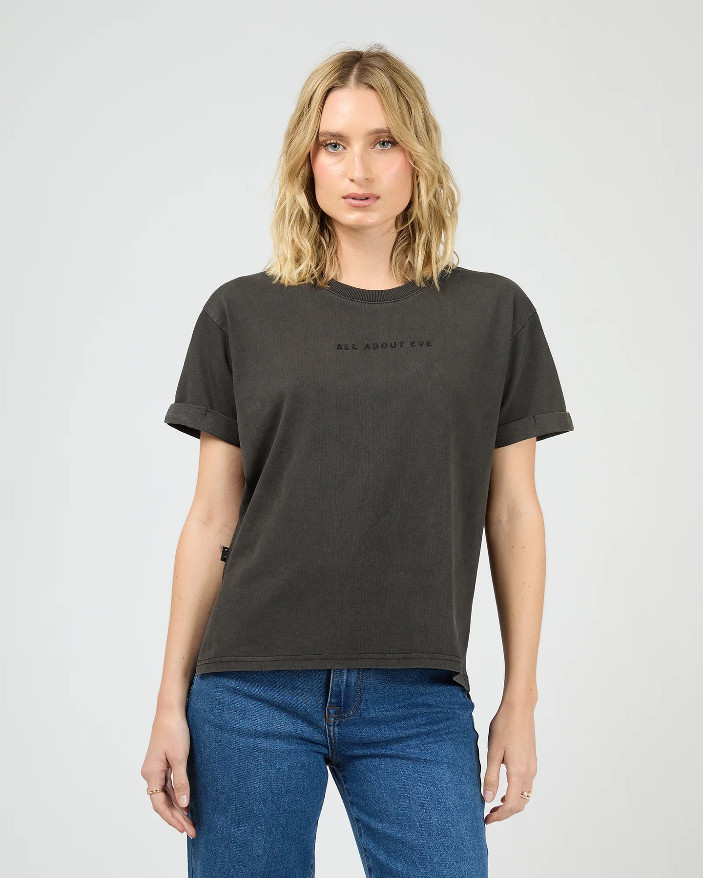 Regular price $39.95All About Eve Washed Tee features a garment wash with a branded chest embroidery. Styled back with denim jeans and sneakers for a chic weekend vibe.