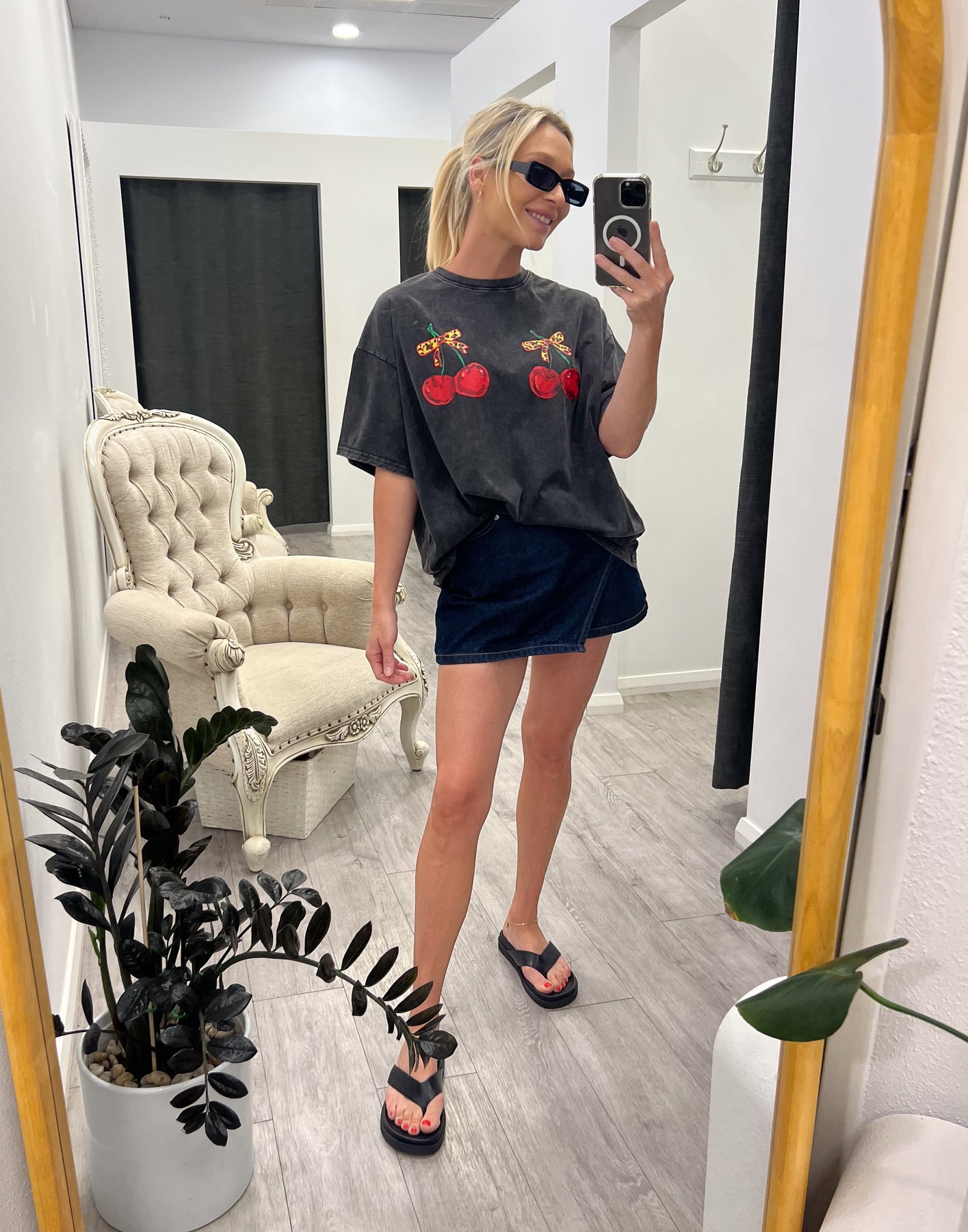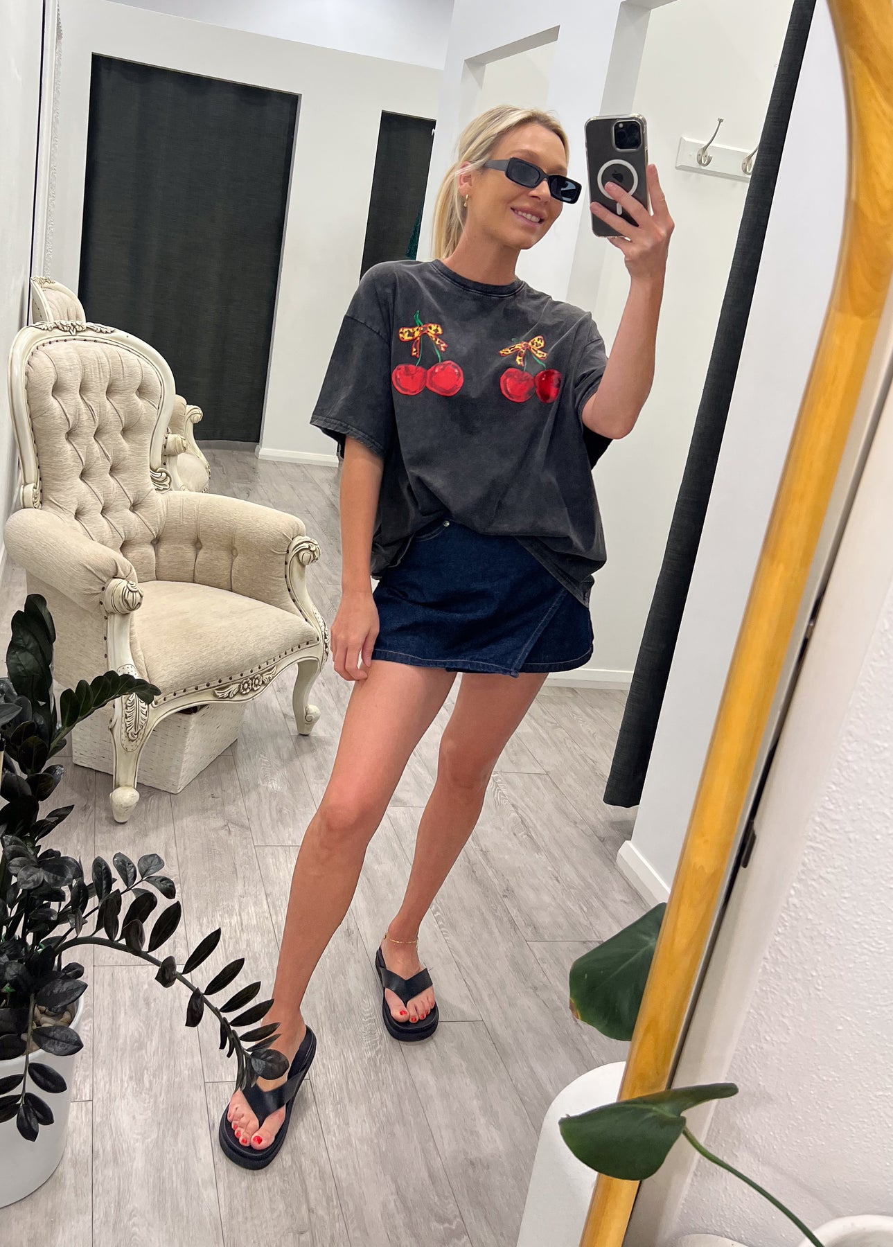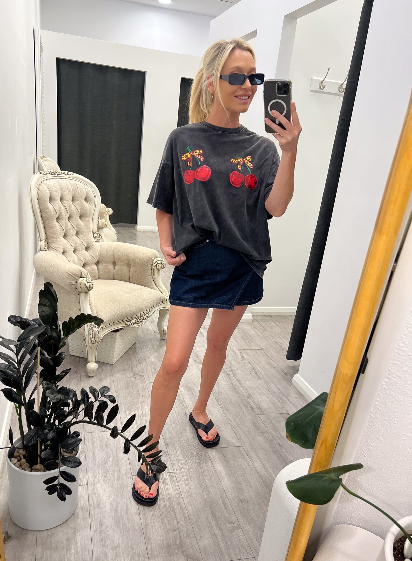 Regular price $99.95The Cherry Denim Shirt is the perfect blend of classic and modern. With its button-up front, chest pockets, and curved hem, it’s a versatile piece for layering or wearing solo. The relaxed fit ensures comfort, making it a must-have for effortless, everyday chic.