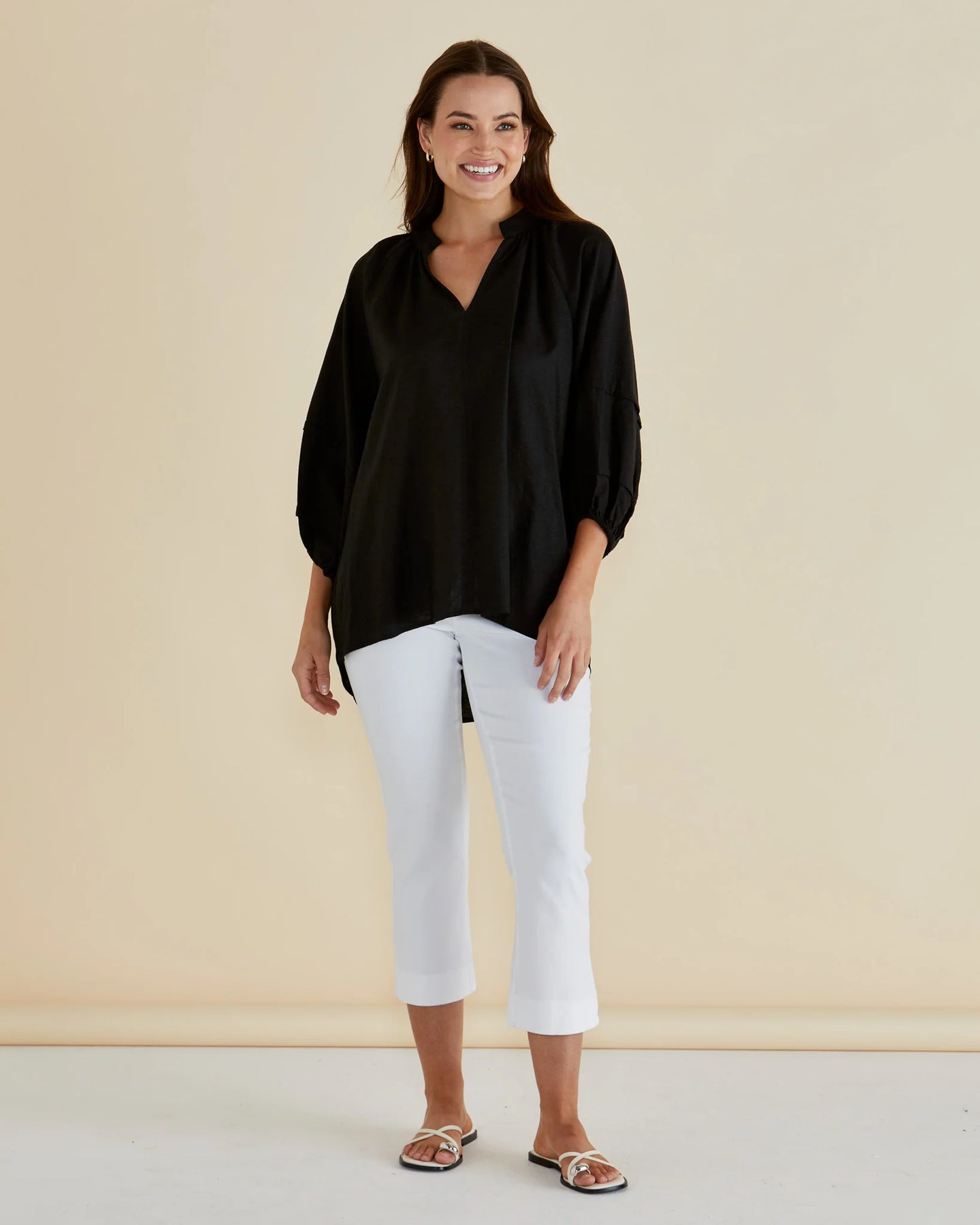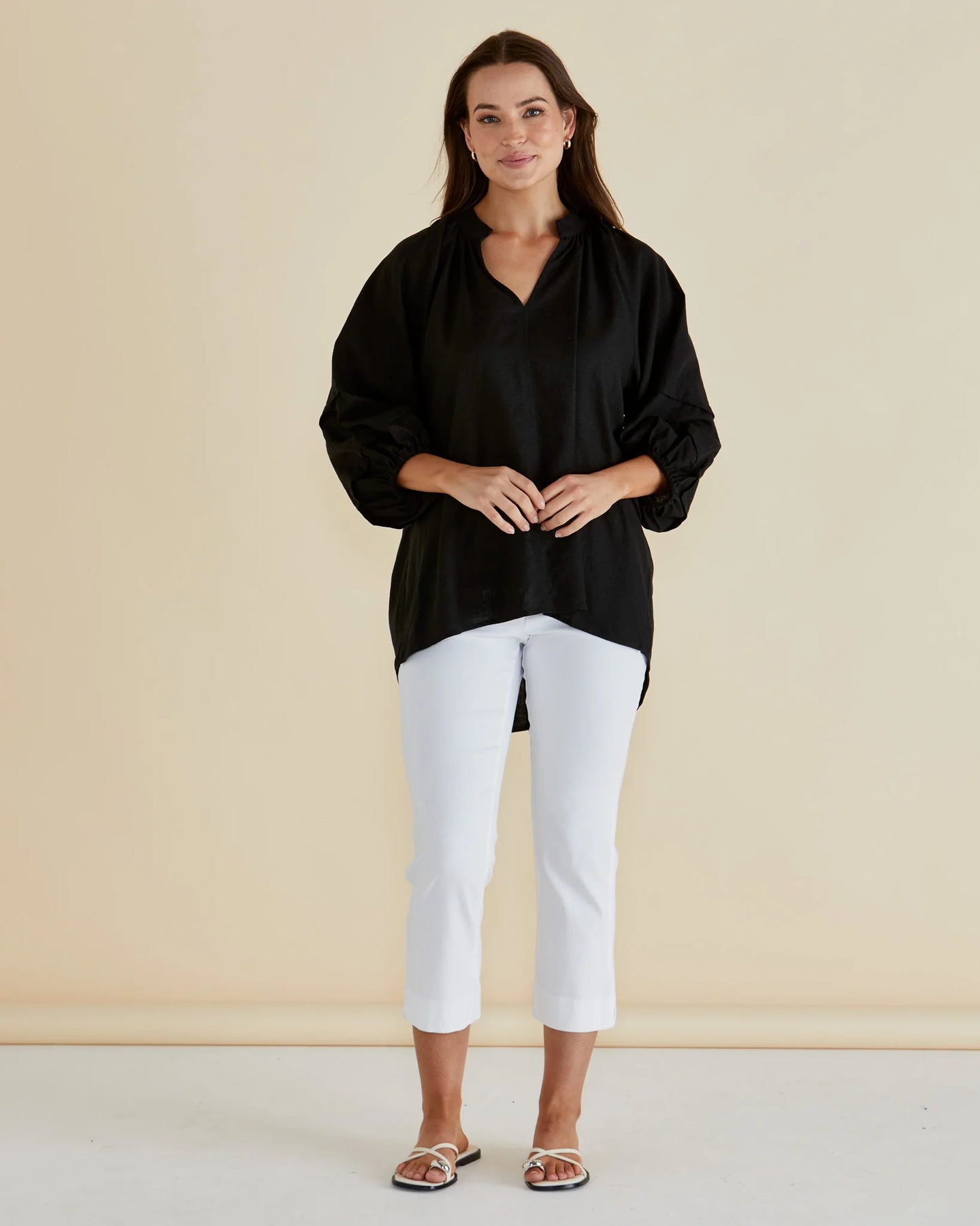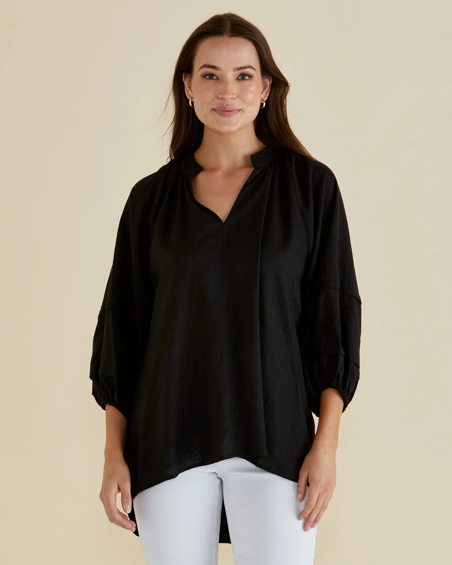 Regular price $79.95Crafted from a breathable viscose/linen blend, the Grazia Blouse features an open V-neckline with a delicate tie neck detail. Long balloon sleeves with elasticated cuffs add an elevated, classic charm. Its oversized fit offers comfortable, effortless transeasonal elegance perfect for polished styling.