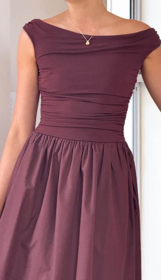 Regular price $159.00Crafted from stretch mesh with a unique in-house print, this fitted off-shoulder maxi dress elegantly contours the silhouette. Featuring a subtle tuck detail and a sleek column skirt, it offers refined structure and ease with its pull-on design. Fully lined for comfort, this dress balances sophistication and effortless style.