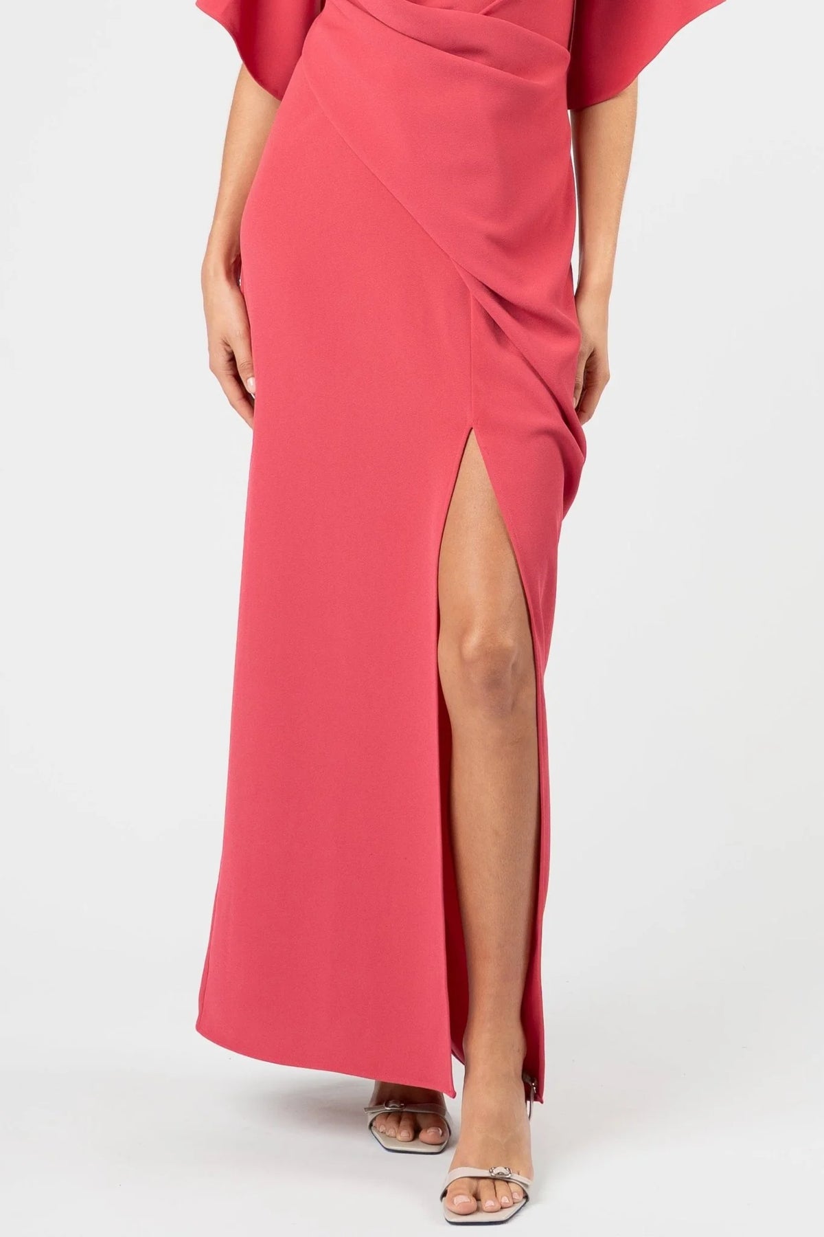 Regular price $499.00The Darcy Maxi in Ruby is cut from a winter-pink crepe that carries depth, polish, and a refined softness suited to formal occasionwear. The silhouette is defined by a sculpted waist drape that flatters the midsection with ease, creating shape without cling. A wrapped neckline frames the décolletage with a clean, confident line, balanced by a structured elbow-length sleeve that offers elegant coverage. Falling into a straight, elongated skirt with a discreet split for movement, the design speaks to modern poise and understated sophistication.