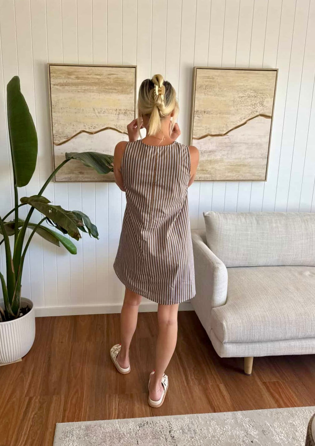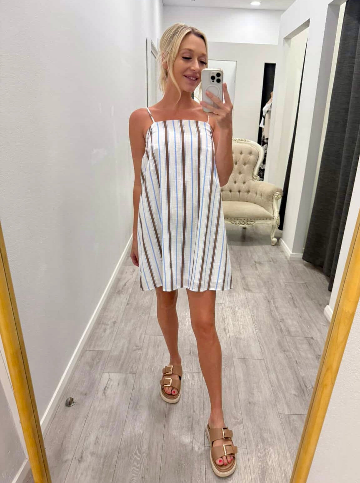 Regular price $99.95The By Frankie Stripe Mini Dress features adjustable shoulder straps, a flattering square neckline, and elasticated back band for a secure fit. Hidden side zipper and full lining complete this elegant piece.