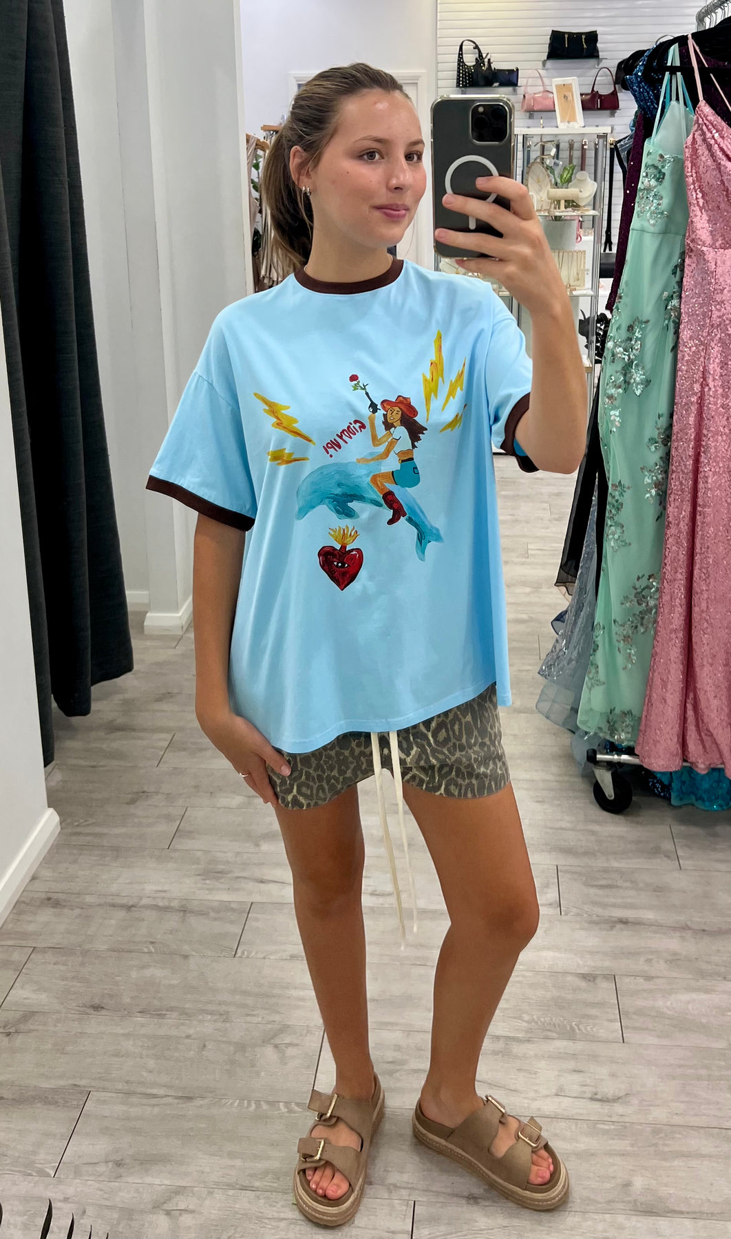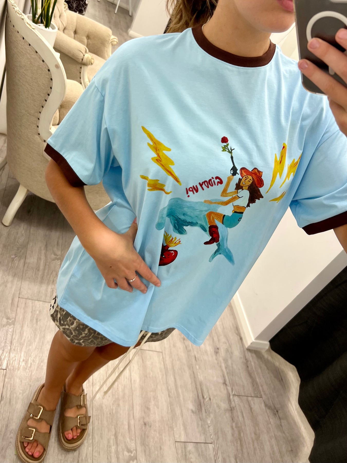 Regular price $59.95The Giddy Up Relaxed Tee in sky captures playful western energy with a vintage-inspired horse graphic across a soft sky-blue base. Designed for everyday wear, this tee blends effortless style with comfort — perfect for pairing with denim shorts, wide-leg pants, or layered under a jacket for a casual rodeo moment. Its relaxed cut and breathable cotton make it a warm-weather staple.