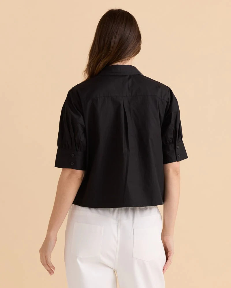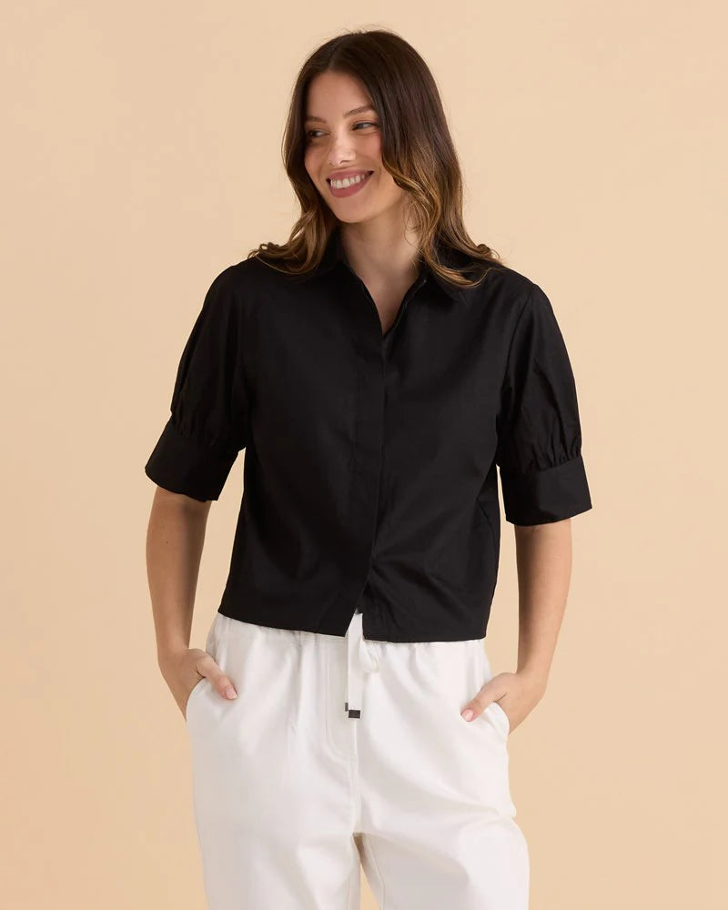 Regular price $79.95A crisp cotton-blend shirt designed for relaxed sophistication. Cuffed short sleeves and a hidden placket keep the look polished. Comfortable for all-day wear and effortless styling. A classic essential with refined detail.