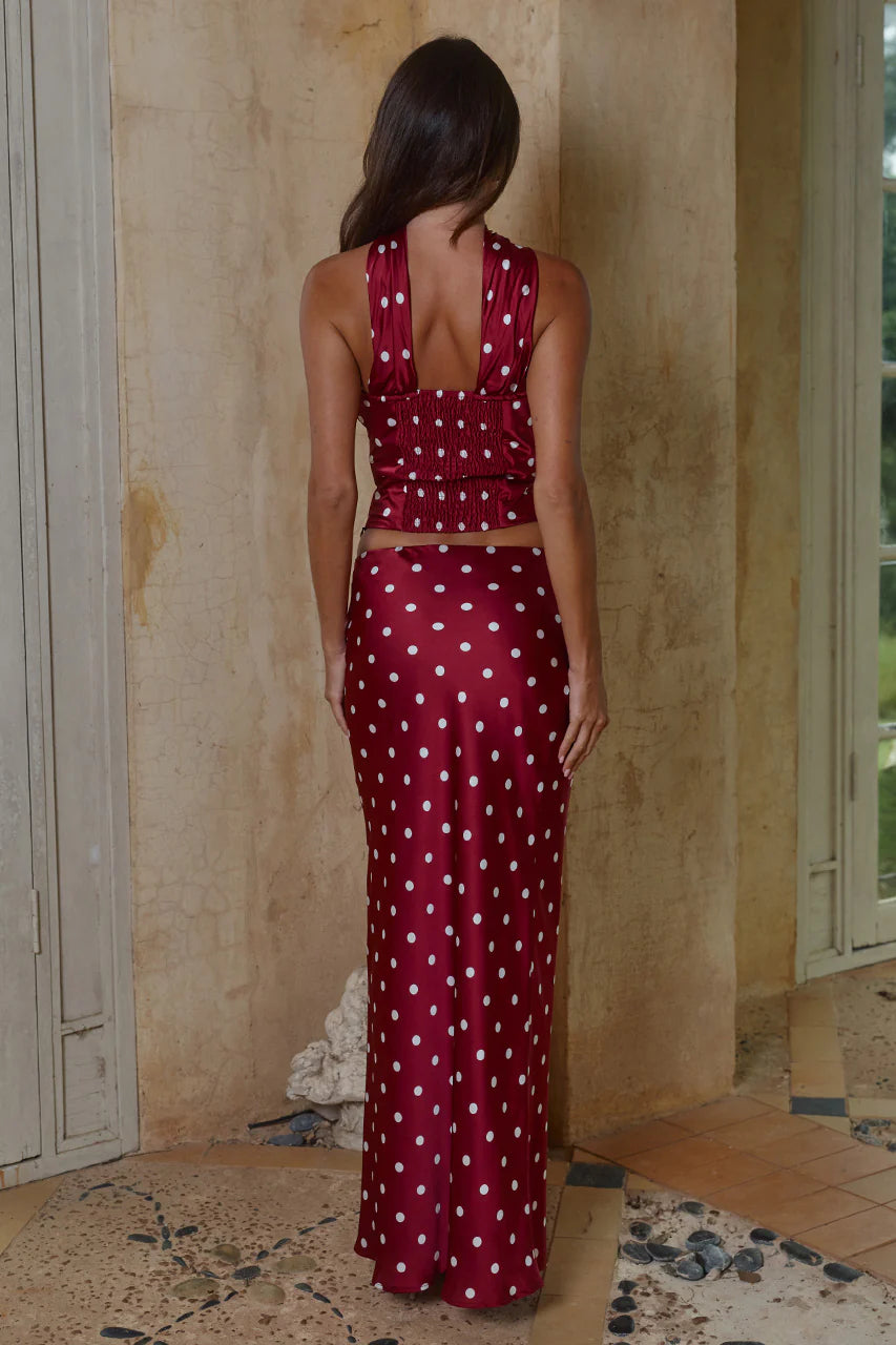 Regular price $89.00Our Blaine Top highlights femininity with a classic polka dot print and the illusion of a strapless neckline. This piece hugs the body and flatters the shoulders, pair with our Blaine Maxi Skirt to complete the look.