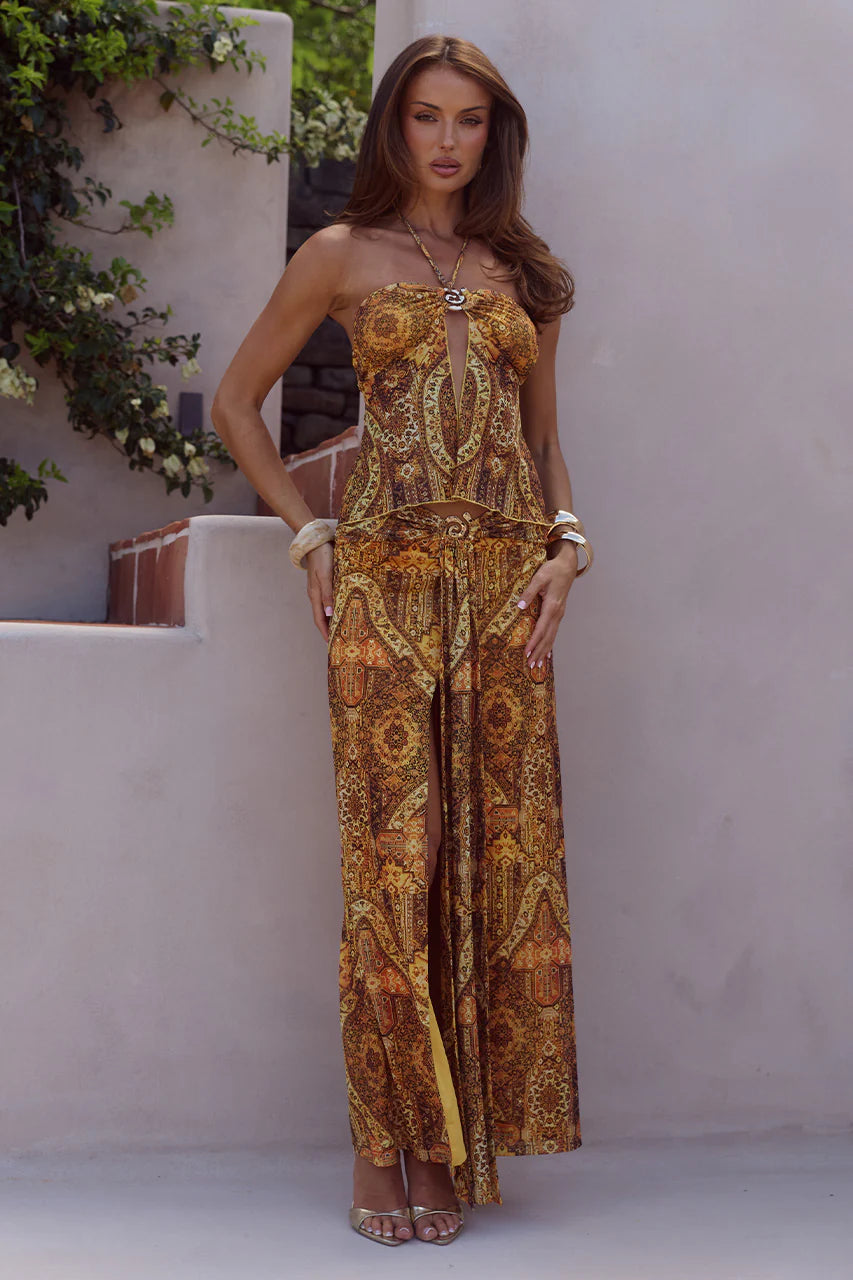 Regular price $79.00Think tropical getaway with a mojito in hand, our Skylar Top features a lush, gold toned print with a front split and sheer waist, pair with our Skylar Maxi Skirt for the complete look.