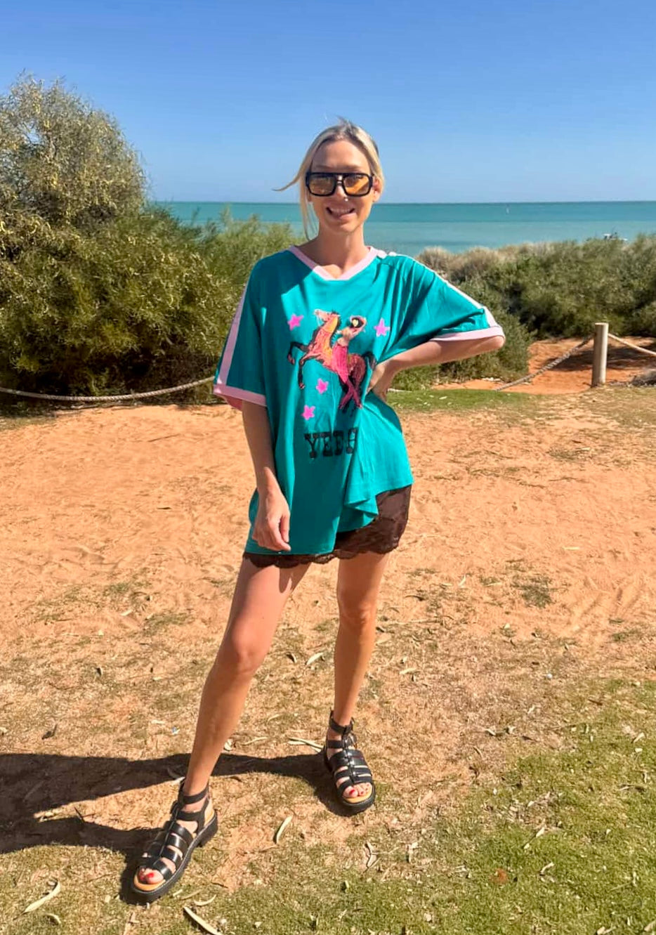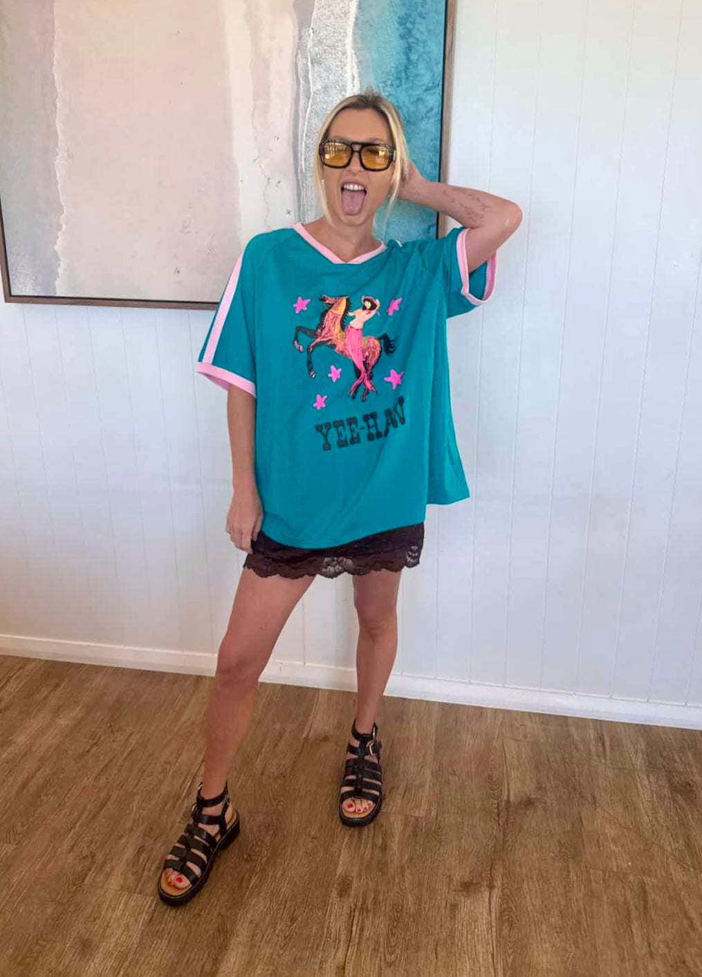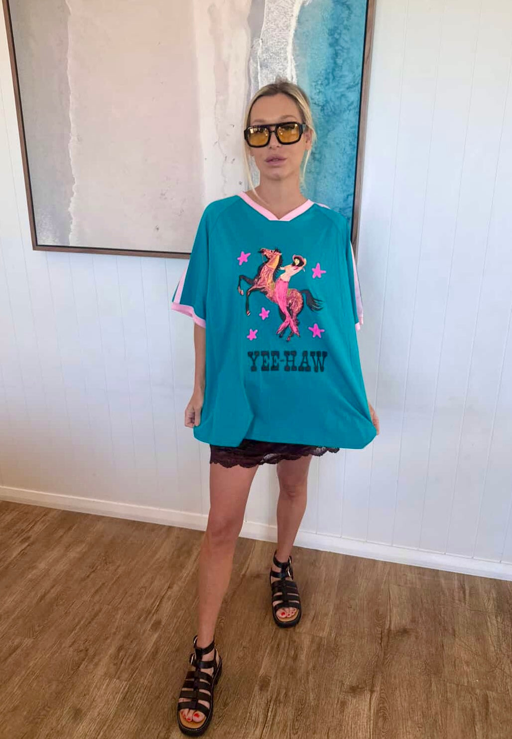 Regular price $59.95The Giddy Up Relaxed Tee in sky captures playful western energy with a vintage-inspired horse graphic across a soft sky-blue base. Designed for everyday wear, this tee blends effortless style with comfort — perfect for pairing with denim shorts, wide-leg pants, or layered under a jacket for a casual rodeo moment. Its relaxed cut and breathable cotton make it a warm-weather staple.
