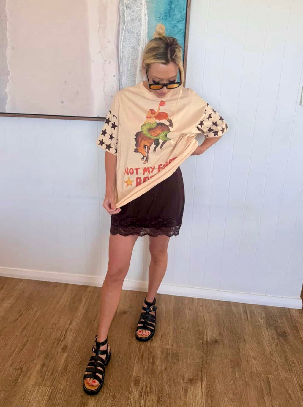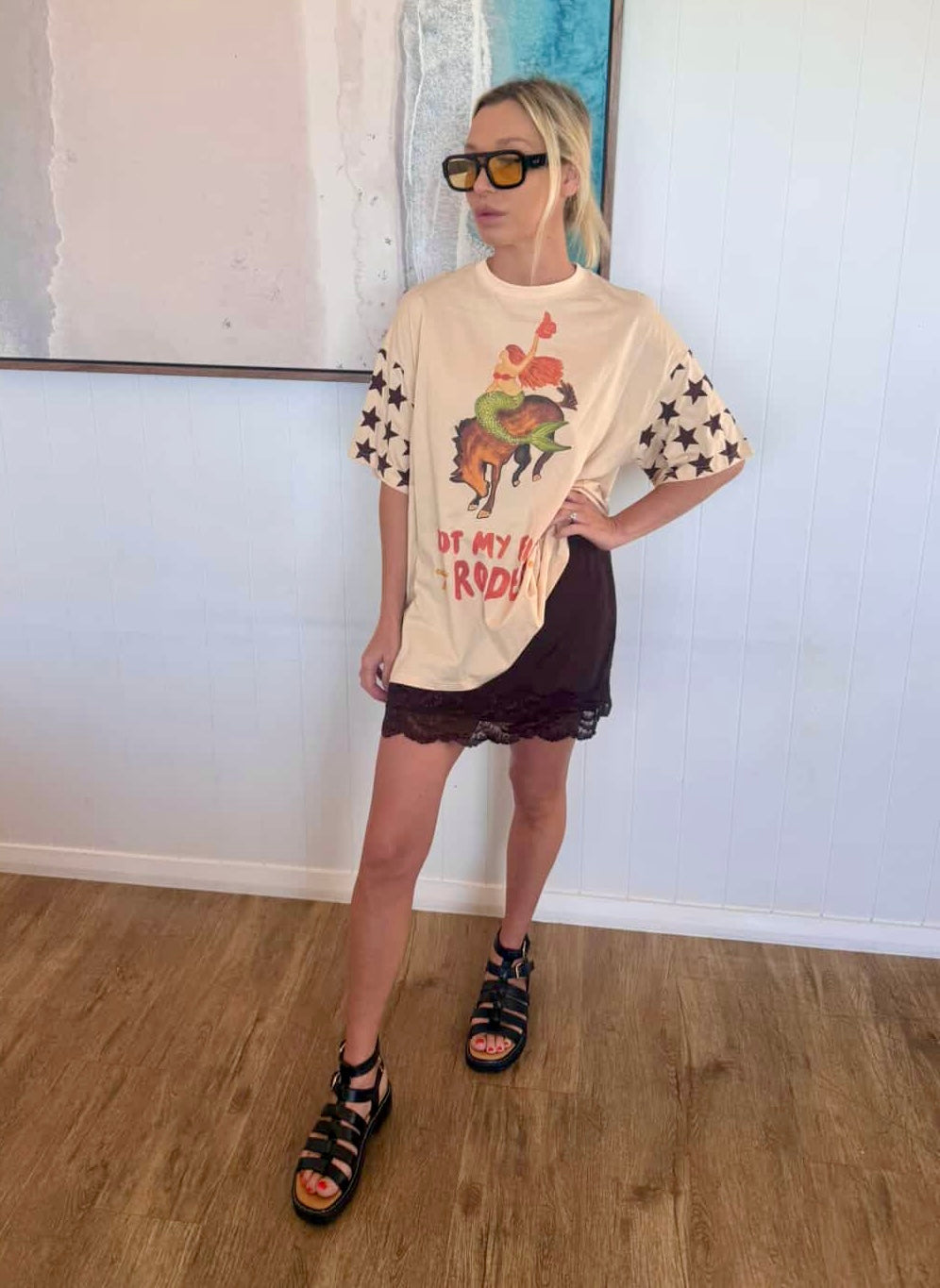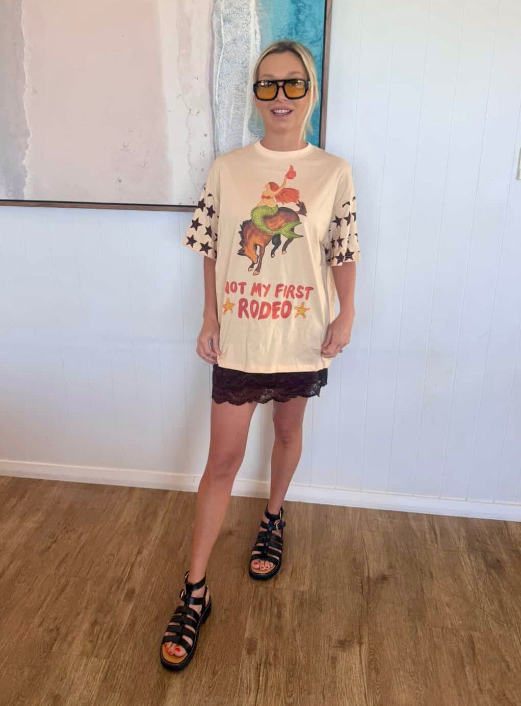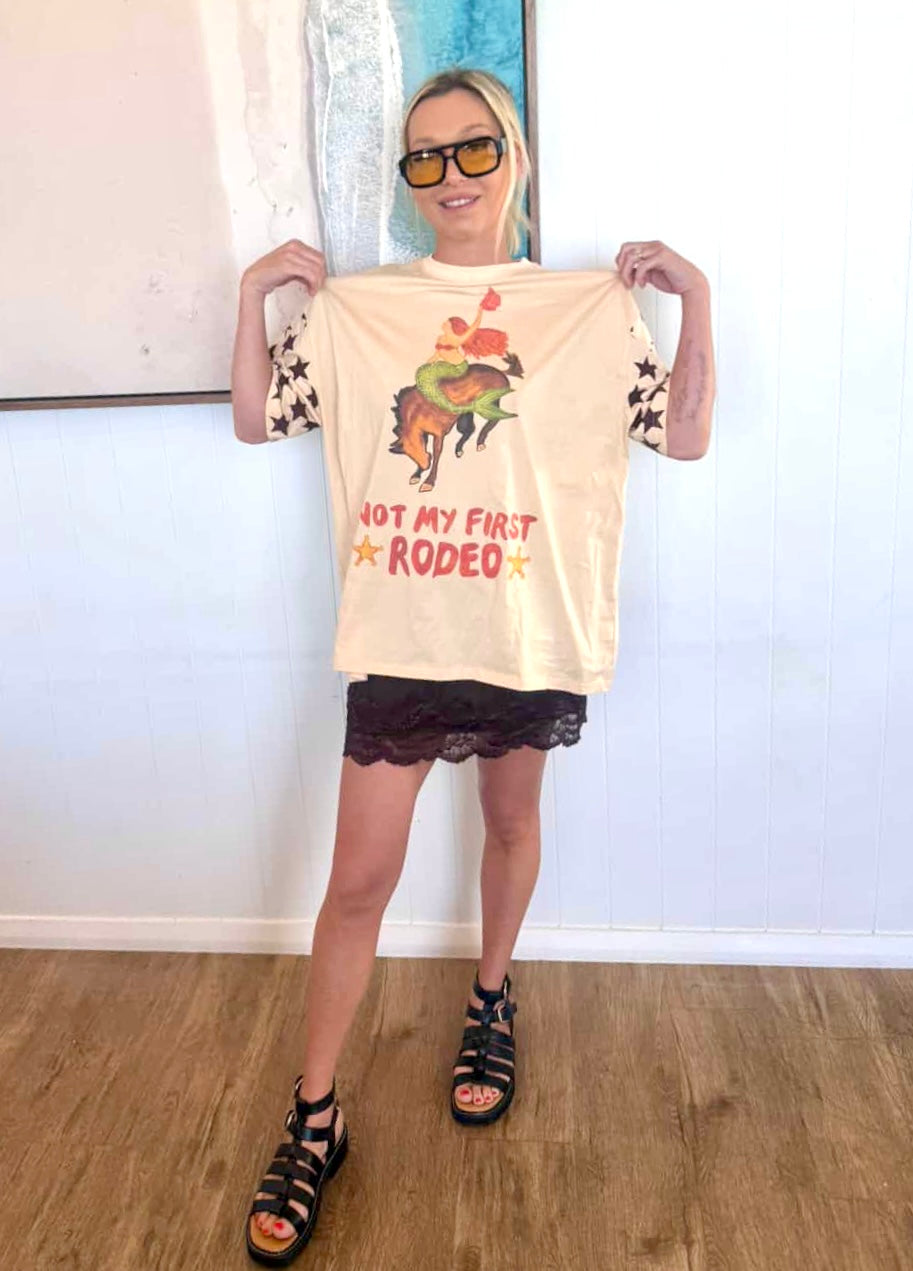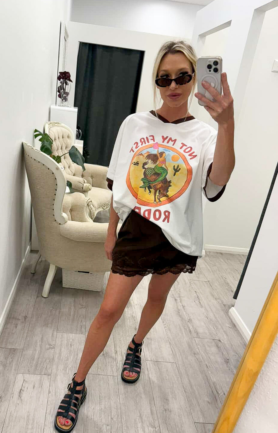 Regular price $85.00Make a statement thats both witty and whimsical with the "Not My First Rodeo" Tee from By Frankie! It has a bold, contrasting brown trim that compliments the white background and detailed graphic design on the front. She looks perfect when paired with a mini skirt and brown boots!