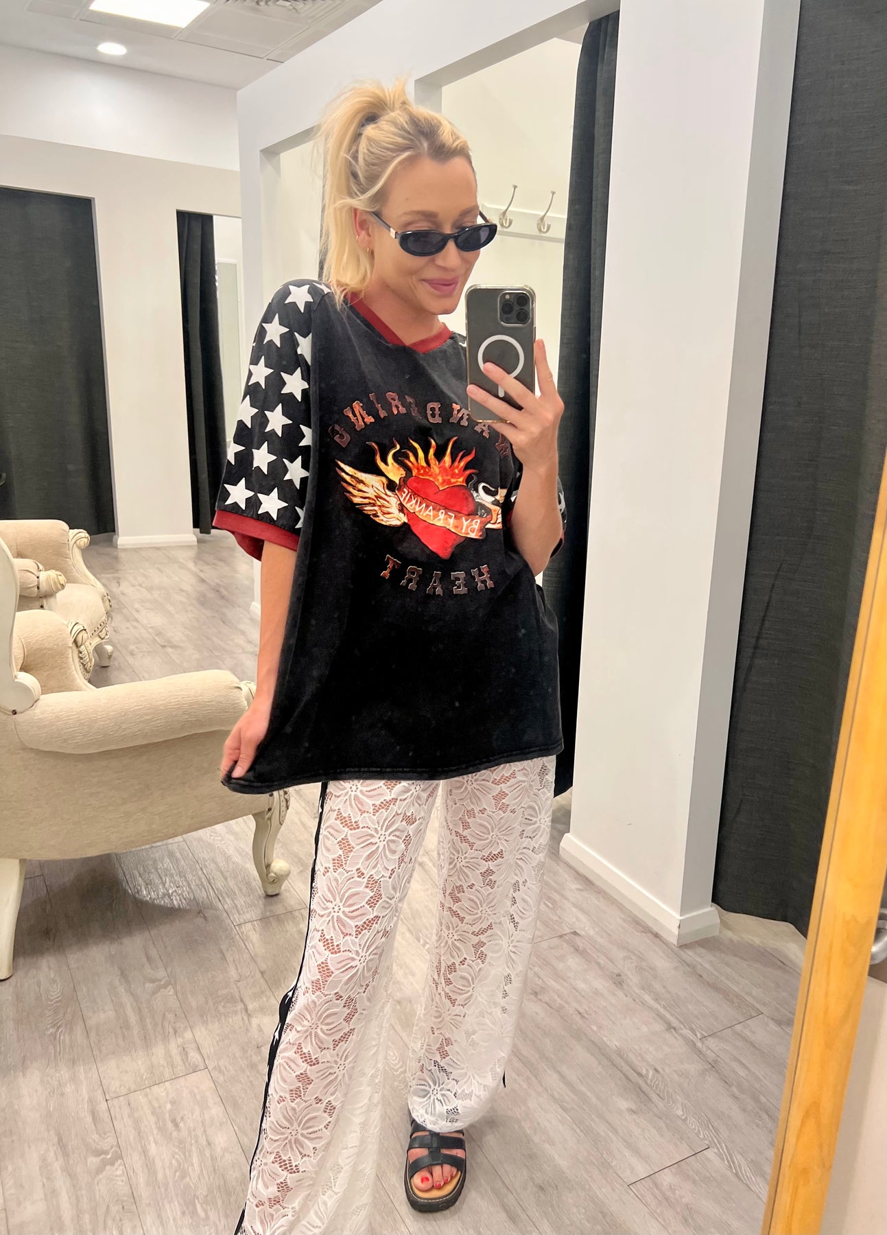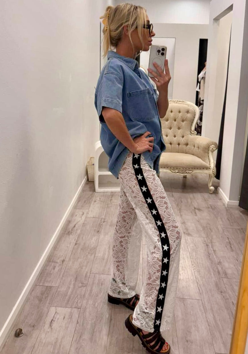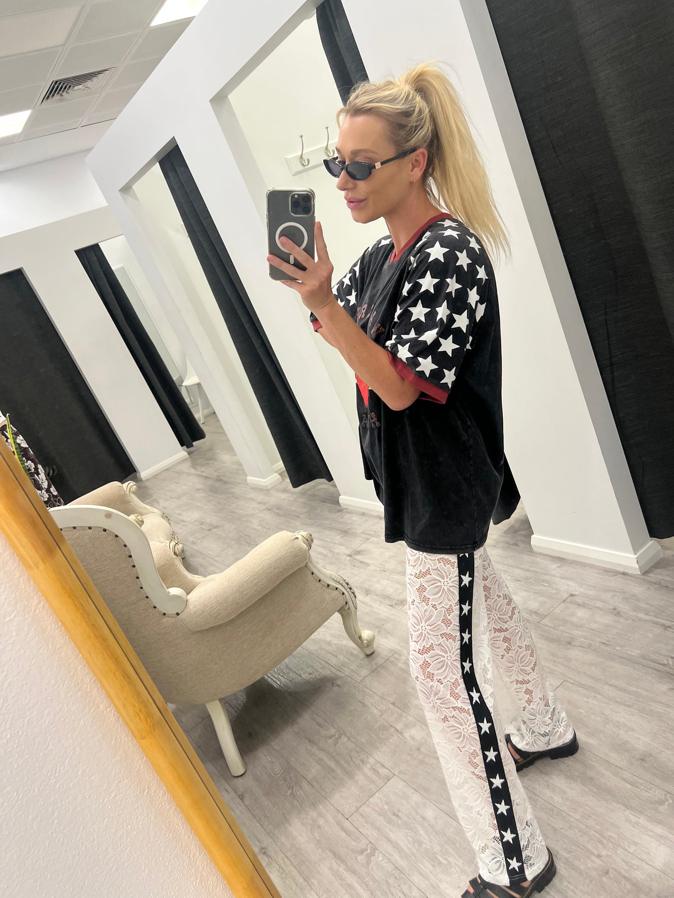 Regular price $89.95The By Frankie Lace Star pants are for sure the coolest new addition to our store. The perfect mixture of sexy and chic, a fun spin on our popular star racer pants.