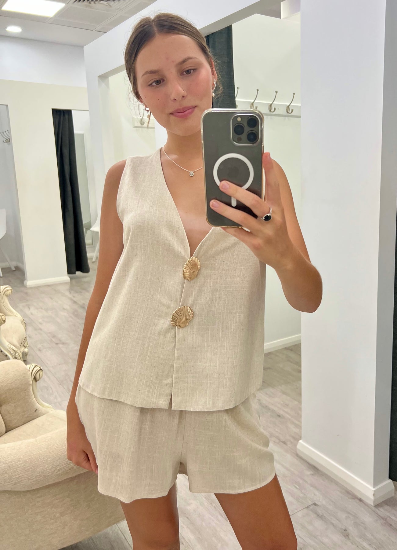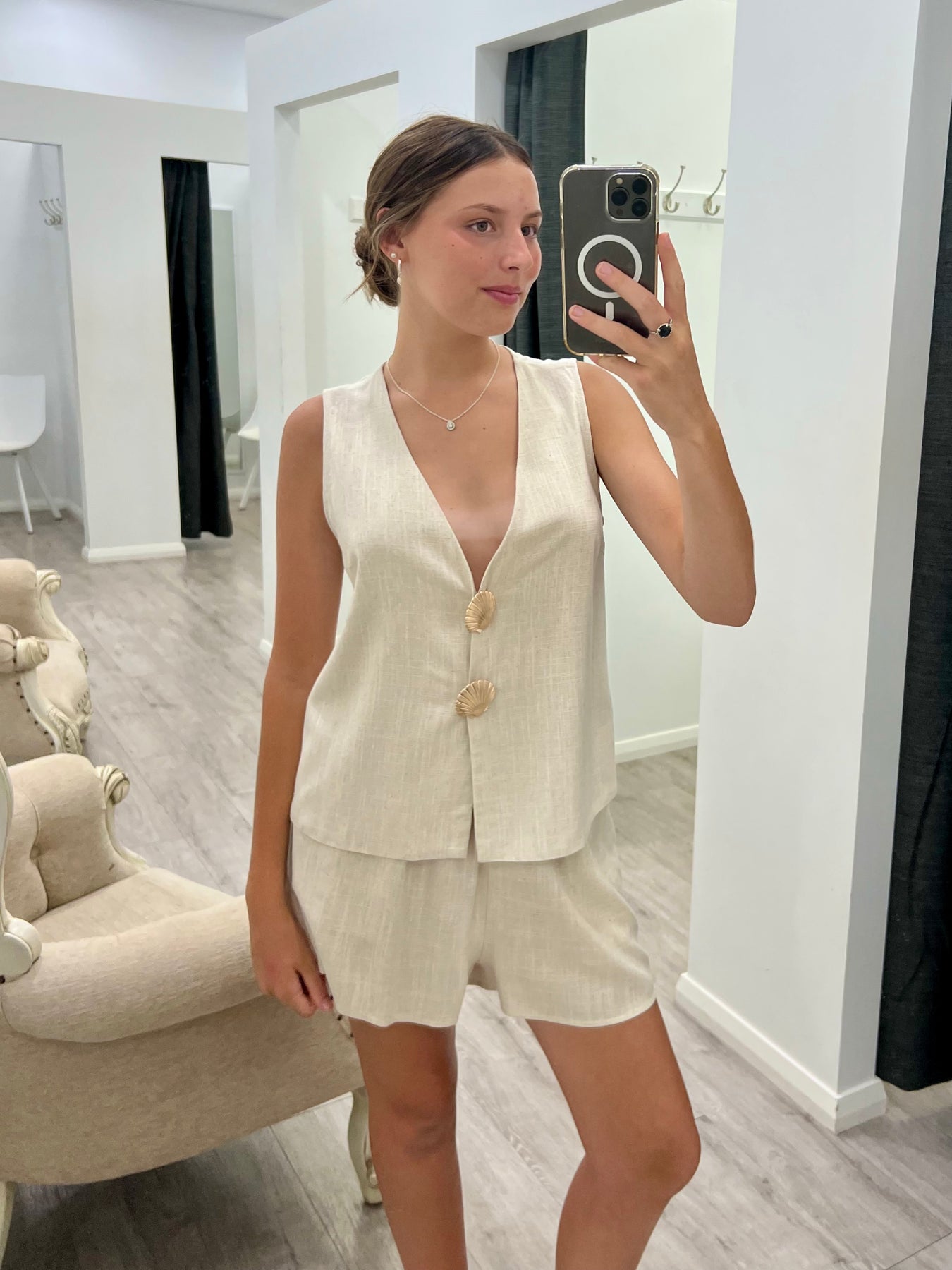Crafted from a luxurious rayon-nylon blend with cotton lining, the Selena Set combines refined elegance with practical functionality. The coordinated vest top features distinctive gold button accents, while the tailored pants offer convenient front pockets and a smooth zip closure. A sophisticated two-piece ensemble designed for effortless style.